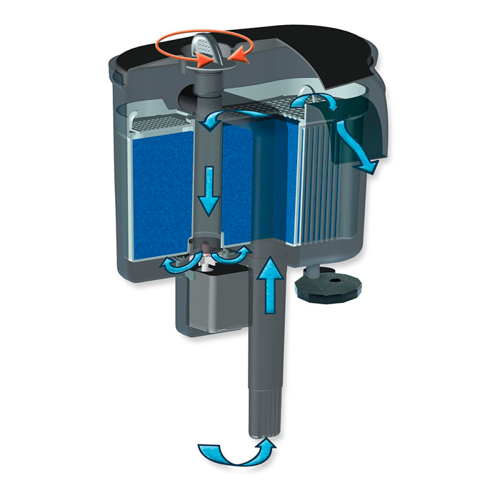 Навесной фильтр VERSAMAX обеспечивает эффективную очистку воды, устраняя механические и биологические загрязнения. VERSAMAX подходит для: открытых аквариумов (вешается на стенку, в воду опускается только заборная трубка); начинающих аквариумистов (простота установки и обслуживания); аквариумов с растениями (не вызывает избыточного течения); создания фитофильтра (поменяйте фильтрующий элемент на керамзит и посадите растение в корпус фильтра). Очищенная вода поступает в аквариум, переливаясь через край корпуса, и создаёт эффект водопада, который вызывает легкое движение поверхности воды, тем самым обеспечивая аэрацию и повышая уровень содержания в ней кислорода. Угол наклона фильтра можно установить с помощью регулятора. Корзины фильтра заполнены двумя губками. Благодаря большому количеству полезных бактерий, живущих на губке, повышается уровень биологической очистки. Возможность поочередной замены фильтрующих элементов позволяет сохранить колонии нитрифицирующих бактерий. Также губки можно заменить на любой биологический или химический наполнитель. Плавная регулировка производительности фильтра позволяет подобрать оптимальную мощность потока. Водозаборная трубка состоит из 3 частей, что позволяет изменять ее длину в соответствии с глубиной аквариума. Всасывающая часть трубки имеет перфорацию, задерживающая крупные частицы грязи. Дополнительно на неё можно надеть губку - префильтр. Фильтр прост в обслуживании: откройте крышку корпуса, извлеките корзинку, промойте или замените фильтрующий элемент. Характеристики: Тип фильтра: внешний. Рекомендуемый объём аквариума: 20 - 100 л. Максимальная производительность: 500 л/ч. Потребляемая мощность: 7.2 Вт. Предназначен: для пресноводного и морского аквариума. Тип очистки: механическая. Фильтрующий материал: губка (2 шт.). Регулятор производительности: есть. Класс защиты: IPX8. Длина кабеля, подключаемого к электросети: 150 см. Напряжение: 220 - 240 В / 50 Гц. Цвет: черный. Гарантийный срок: 2 года.