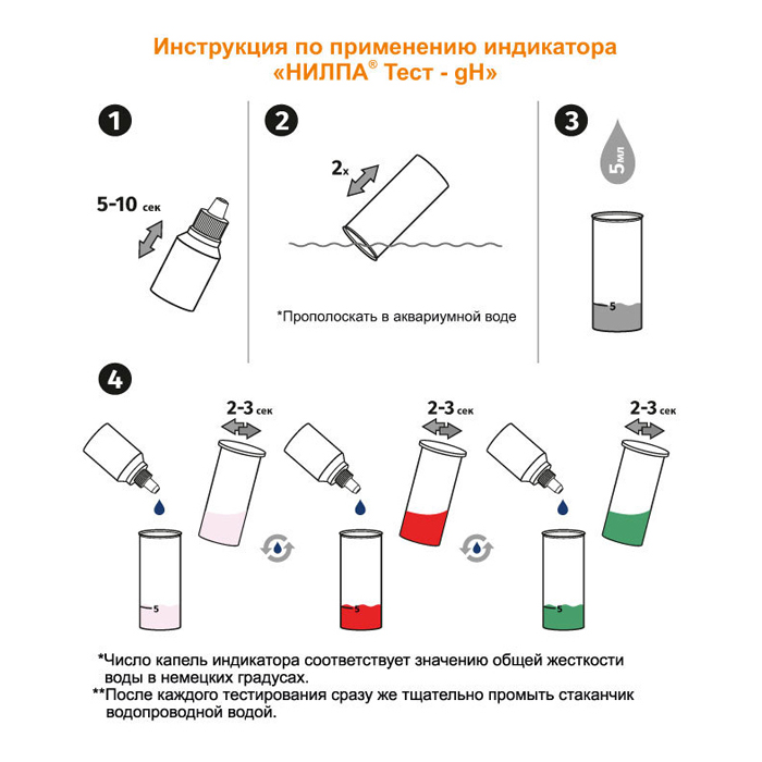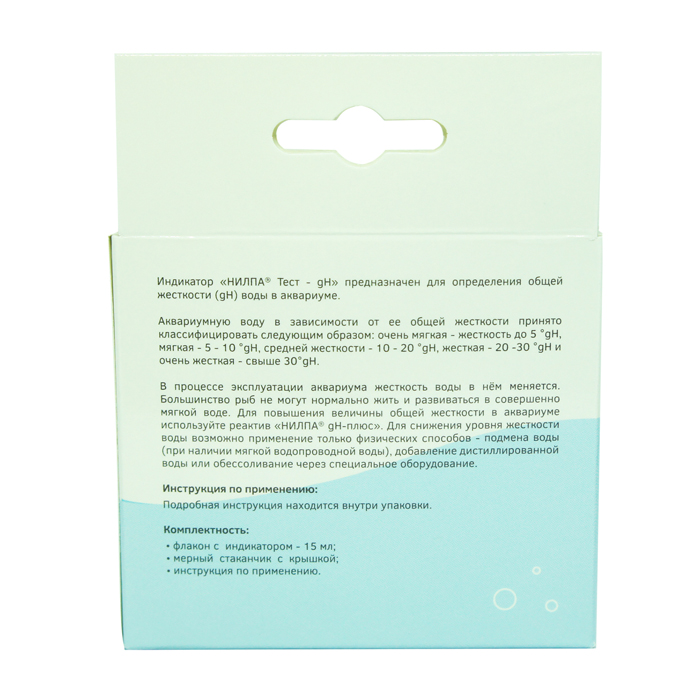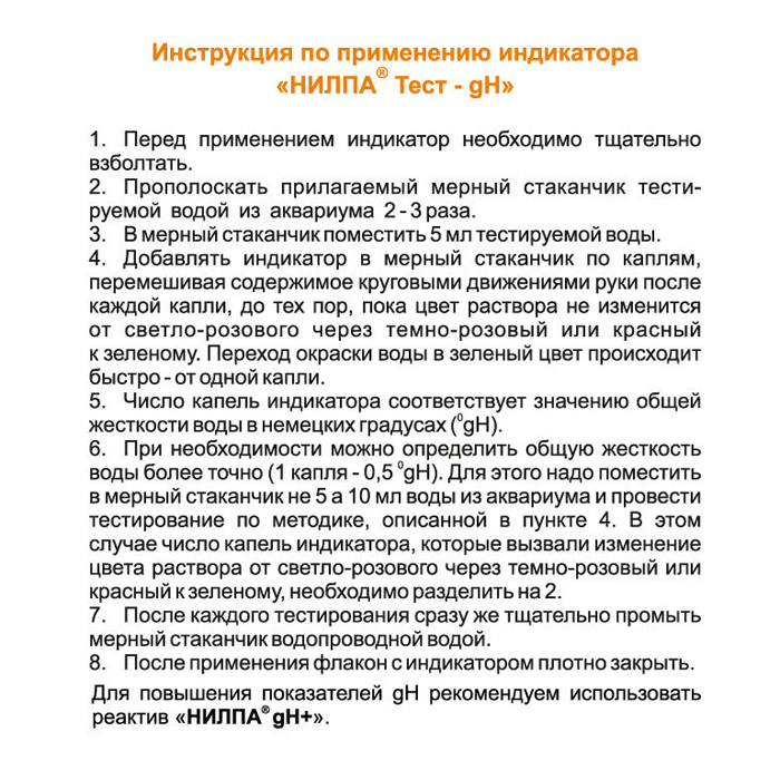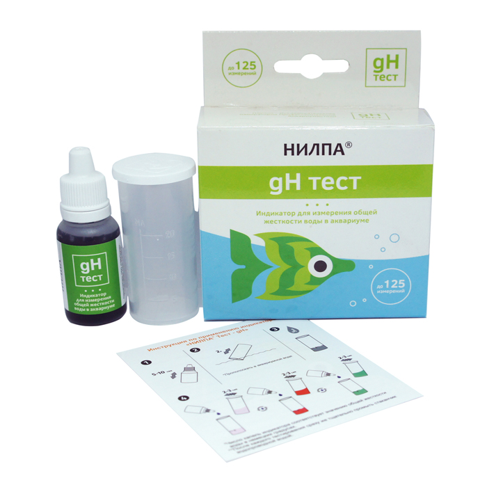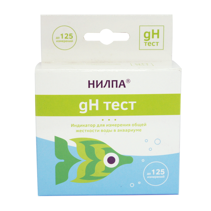 Индикатор «НИЛПА® Тест-gH». Предназначен для определения общей жесткости воды в аквариуме. Аквариумную воду в зависимости от ее общей жесткости принято классифицировать следующим образом: очень мягкая — жесткость до 5° gH, мягкая — 5-10° gH, средней жесткости — 10-20° gH, жесткая — 20-30° gH и очень жесткая — свыше 30° gH. В процессе эксплуатации аквариума жесткость воды в нем меняется. Большинство рыб не могут нормально жить и развиваться в совершенно мягкой воде. Для повышения величины общей жесткости в аквариуме используйте реактив «НИЛПА® gH-плюс». Для снижения уровня жесткости воды возможно применение только физических способов — подмена воды (при наличии мягкой водопроводной воды), добавление дистиллированной воды или обессоливание через специальное оборудование.
