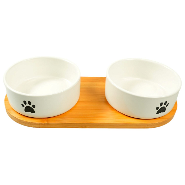 Миска двойная на бамбуковой подставке, 2*350мл, керамика/бамбук,белая, MKR543745, MR.KRANCH