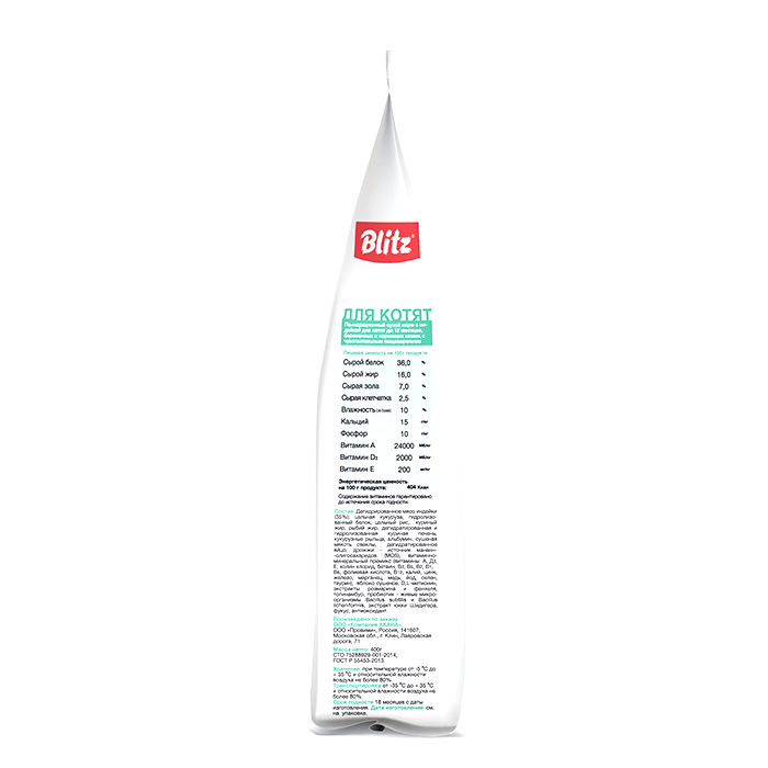 В чём преимущества Blitz Kitten для котят? Оптимальное содержание мясных белков, жиров и энергии обеспечивают особые потребности растущих котят, корм может быть использован для беременных и кормящих кошек. Содержащиеся в корме пробиотики улучшают усвояемость корма и поддерживают иммунитет. Корм содержит ненасыщенные жирные кислоты Омега-3 и Омега-6, обеспечивающие иммунитет, здоровую кожу и отличную шерсть. Корм включает качественные низкоаллергенные зерновые культуры: рис и кукурузу. Не содержит пшеницу, зачастую являющуюся причиной аллергии. Экстракт Юкки Шидигера улучшает пищеварительный процесс, снижает метеоризм и уменьшает запах фекалий.