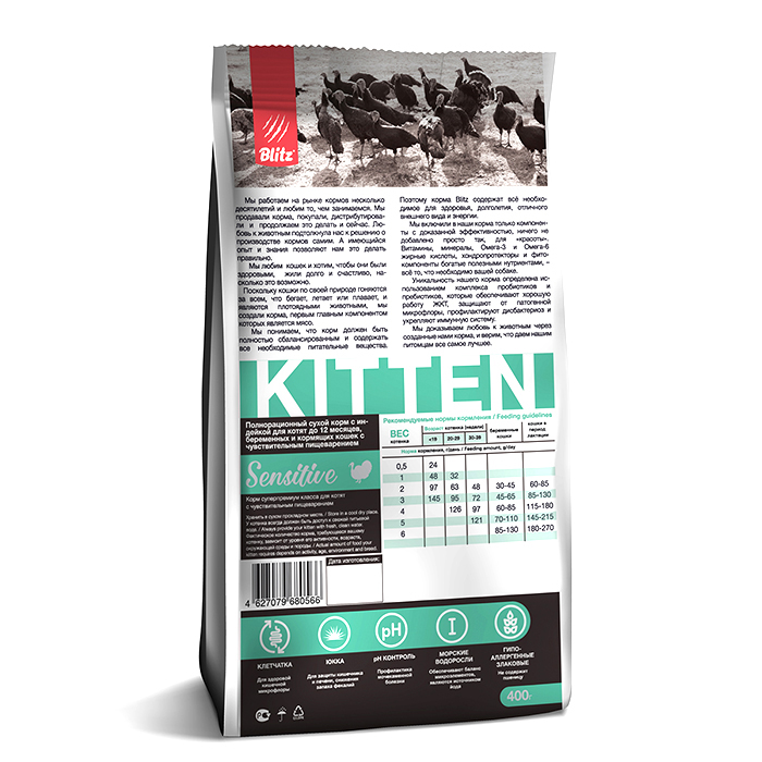 Блиц СЕНСИТИВ сухой корм для котят, беременных и кормящих кошек с индейкой, 400г, BLITZ Sensitive Kitten