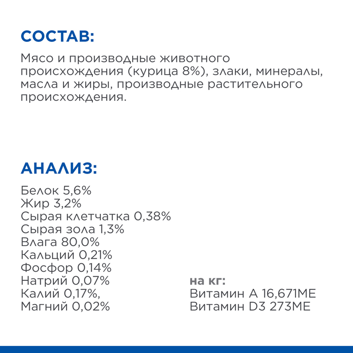 Состав: Мясо и производные животного происхождения (курица), злаки, минералы, масла и жиры, производные растительного происхождения. Питательные вещества: Белок 5,6%, Жир 3,2%, Сырая клетчатка 0,38%, Сырая зола 1,3%, Влага 80,0%, Кальций 0,21%, Фосфор 0,14%, Натрий 0,07%, Калий 0,17%, Магний 0,02%; на кг: Витамин А 16 671МЕ, Витамин D3 273МЕ. Добавки на кг: 3b103 (Железо) 10,1мг, 3b202 (Йод) 0,3мг, 3b405 (Медь) 1,7мг, 3b502 (Марганец) 2,2мг, 3b603 (Цинк) 26,0мг. Калорийность: Ккал/100г: 80.