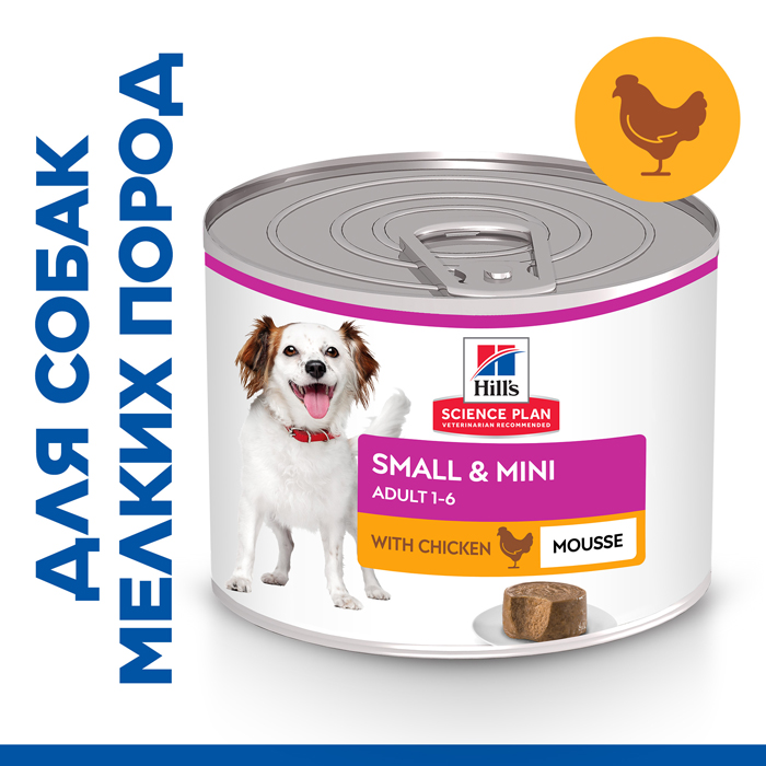 Влажный корм Hill's Science Plan Small&Mini для взрослых собак мелких пород, мусс с курицей, 200г. Это полноценный рацион с мягкой текстурой для взрослых собак мелких пород в возрасте от 1 до 6 лет. Этот рацион разработан с учетом уникальных потребностей собак мелких пород в период расцвета их жизни. ПРЕИМУЩЕСТВА Hill's Science Plan Small&Mini: ✔ Мягкая муссовая текстура, великолепный вкус ✔ Содержит оптимальное сочетание белков, жиров и углеводов, обеспечивая вашего питомца необходимой энергией ✔ Поддерживает иммунную систему благодаря мощному комплексу антиоксидантов ✔ Поддерживает здоровое пищеварение благодаря легко усваиваемым ингредиентам.