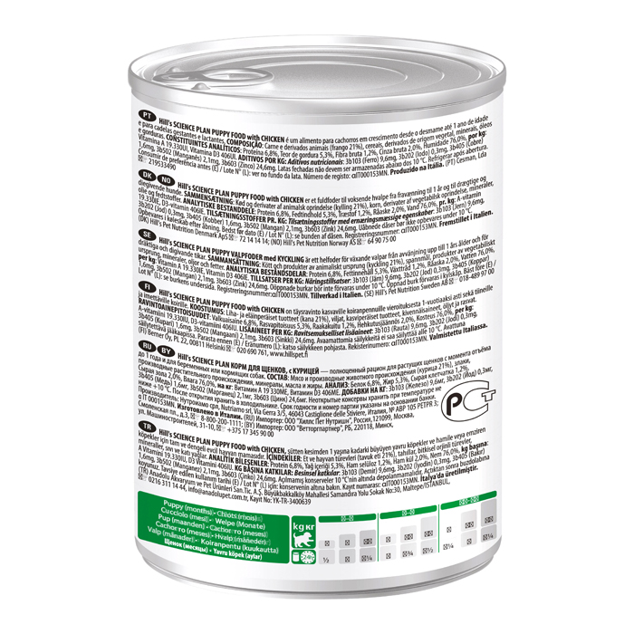 Влажный корм (консервы) Hill's Science Plan для щенков для поддержания здорового роста и развития, с курицей, 370г. Hill's Science Plan с курицей для щенков создан для поддержания иммунной системы и подвижности. Содержит антиоксиданты с клинически подтвержденным эффектом и ДГК из рыбьего жира. ПРЕИМУЩЕСТВА: ✔ Антиоксиданты с клинически подтвержденным эффектом для здоровья иммунной системы ✔ Омега-3 жирные кислоты и оптимальный уровень минералов для правильного развития скелета и подвижности ✔ Ингредиенты высокого качества для легкого пищеварения ✔ Великолепный вкус. Это корм для щенков с великолепным вкусом для долгой и счастливой жизни. Никто вас не встретит так, как ваша собака, – виляя хвостом и облизывая ваше лицо. Каждый момент, который вы проводите вместе с питомцем, особенный, и мы стремимся подарить вам больше таких моментов. Консервированный корм для щенков Hill's Science Plan изготовлен из высококачественных ингредиентов с правильно подобранными питательными веществами для поддержания здорового развития вашего щенка. Все ингредиенты в составе корма соответствуют нашим строгим и превосходящим отраслевые стандарты требованиям к чистоте и содержанию питательных веществ.