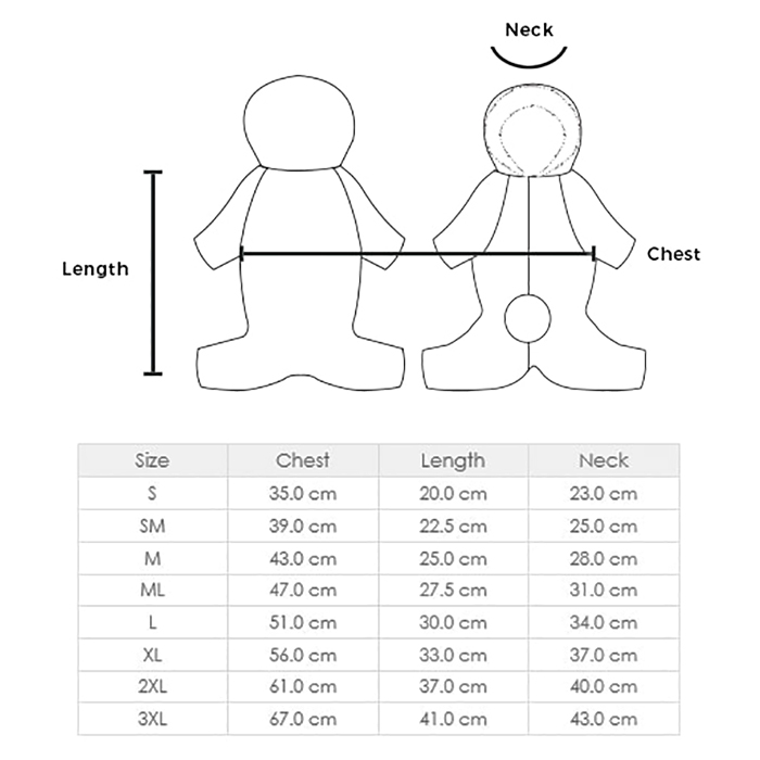 • Размер 2XL: длина спины 37см, обхват груди 61см, обхват шеи 40см