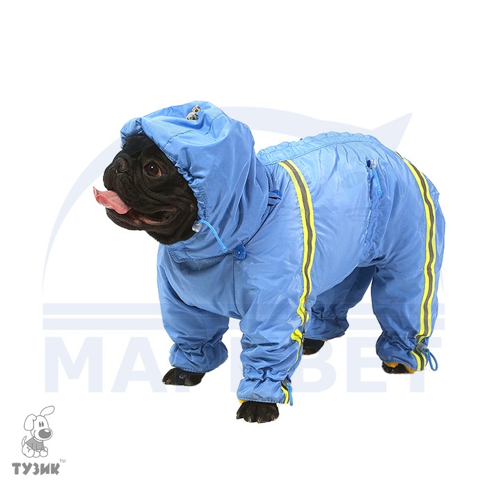 • с функциональными шнурками с зажимами на горловине, поперек комбинезона (туловища собаки), в нижней части штанин и по переднему краю капюшона, которые обеспечивают удобство регулировки одежды по телу питомца.
