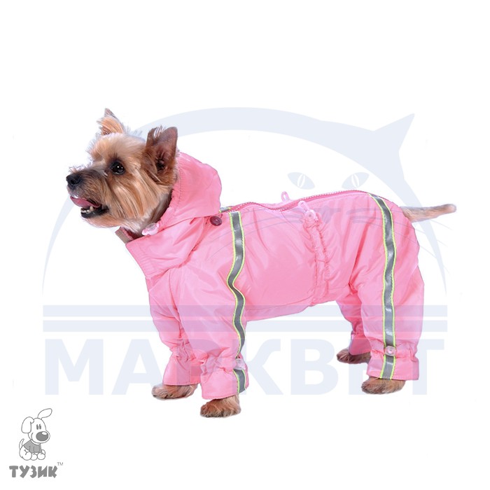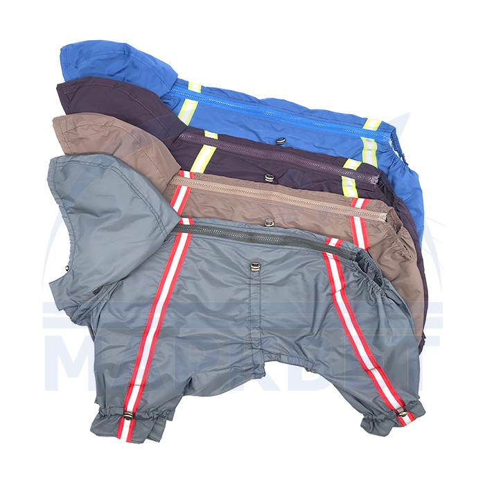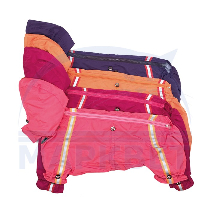 Комбинезон спортивный дождевик с отстегивающимся капюшоном выполнен из плащевокурточной ткани со специальной водоотталкивающей пропиткой и ветрозащитными свойствами (WR, PU). Предназначен для прогулок в прохладную сырую и ветреную погоду. Производится на все породы собак. Расцветки комбинезонов - разнообразные. Варианты исполнения комбинезона: