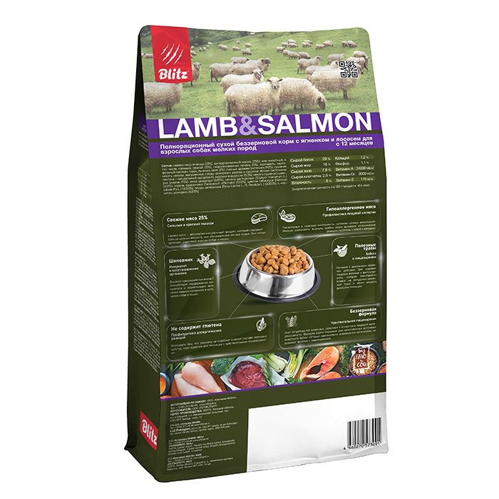 Blitz Lamb & Salmon, 8кг. Полнорационный сухой беззерновой корм с ягненком и лососем для взрослых собак мелких пород c 12 месяцев. Гипоаллергенный корм для чувствительного пищеварения. Беззерновой сухой корм для взрослых собак мелких пород — это полнорационное питание для поддержания здоровья вашей собаки. Разработан с учетом особенностей мелких пород. Основу корма составляет ягнёнок — идеален для собак с чувствительным пищеварением, и лосось, который дарит корму отличный вкус, улучшает состояние кожи и шерсти. Фрукты и овощи насыщают организм витаминами, минералами и фитонутриентами. Цикорий нормализует пищеварение, а расторопша поддерживает правильную работу печени. Комплекс из шиповника, гибискуса и одуванчика, а также пребиотиков FOS и MOS, обладая антиоксидантным действием, улучшает общее состояние организма вашего питомца.