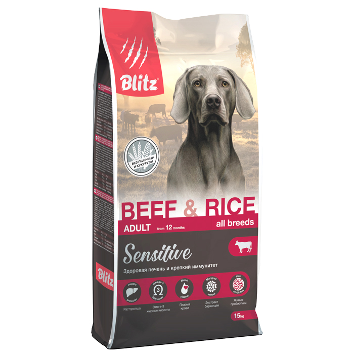 Блиц СЕНСИТИВ сухой корм для собак всех пород с говядиной и рисом, 15кг, BLITZ Sensitive Adult Beef & Rice
