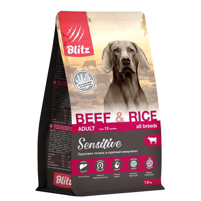 Блиц СЕНСИТИВ сухой корм для собак всех пород с говядиной и рисом, 1,8кг, BLITZ Sensitive Adult Beef & Rice
