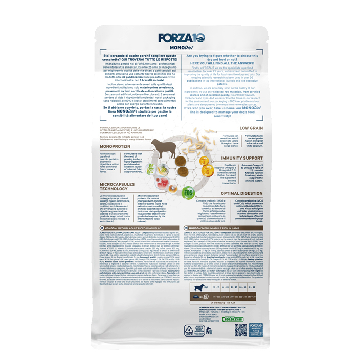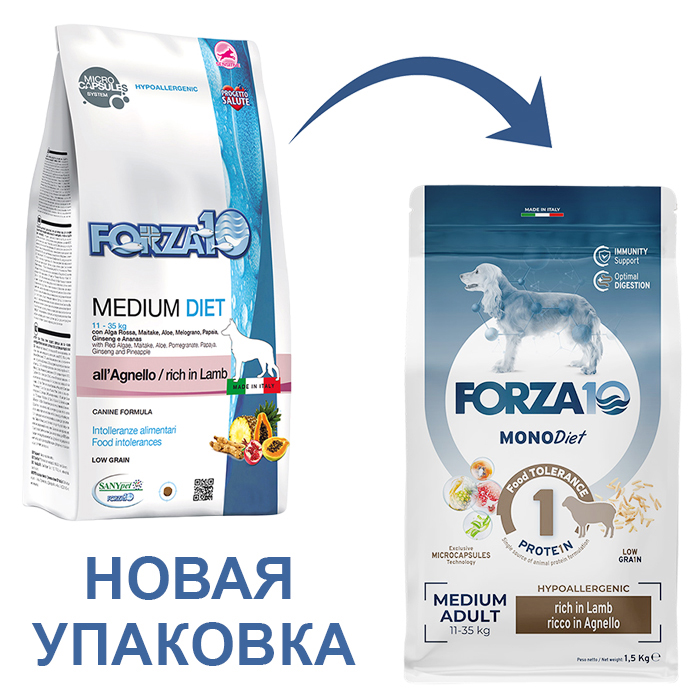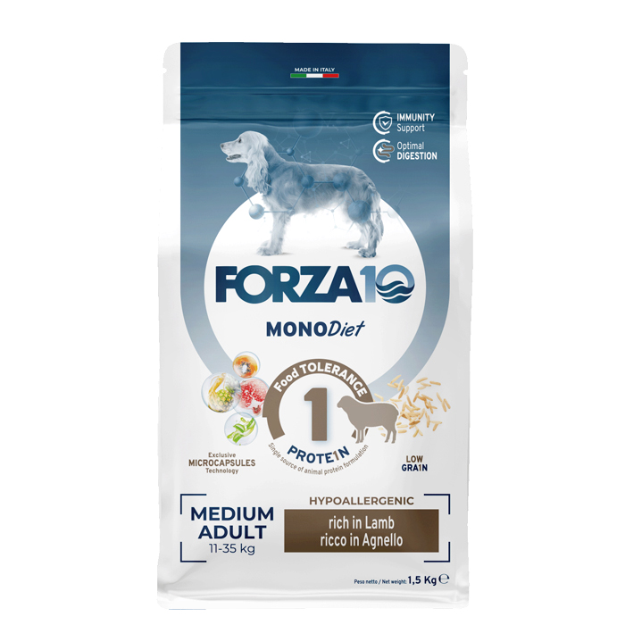 Forza10 Monodiet MEDIUM ADULT полнорационный гипоаллергенный корм для взрослых собак средних пород, с ягненком, 1,5кг. Корм разработан для снижения непереносимости к ингредиентам и питательным веществам у собак средних пород. ПРЕИМУЩЕСТВА: ✔ Источник животного белка, предназначенный для снижения пищевой непереносимости ✔ Low Grain: низкое содержание зерновых ✔ С рыбьим жиром: природные антидегенеративные и противовоспалительные свойства ✔ Сбалансированное соотношение Омега3 и Омега6: 1:3 ✔ В состав корма входят экстракты растений, свойства которых хорошо известны в фитотерапии и традиционной медицине. Красные водоросли (Haematococcus pluvialis): содержат астаксантин с сильными антиоксидантным и иммуномодулирующим действиями. Майтаке (Grifola frondosa): это съедобный гриб, растущий в северных регионах Японии и восточных регионах Северной Америки. Высокое содержание бетаглюканов обеспечивает прекрасное воздействие на иммунную систему. Алоэ (Aloe vera): благодаря высокому содержанию активных веществ обладает успокаивающим, иммуностимулирующим и очищающим свойствами. Гранат (Punica granatum): насыщен полифенолами, которые противостоят окислению липидов и вредному воздействию свободных радикалов, в нём содержатся незаменимые жирные кислоты, олеиновая и линолевая, которые так необходимы организму. Папайя (Carica papaya): антиоксидант богатый витамином С, магнием, кальцием и калием, усиливает естественные защитные функции организма. Женьшень (Panax ginseng): заряжает организм энергией, особенно полезен при любых стрессовых состояниях. Ананас (Ananas spp.): плод, особенно в области ножки, содержит многочисленные полезные вещества, среди которых бромелин, протеолитический энзим, способствующий процессу пищеварения ✔ Инновационная технология микрокапсулирования для введения натуральных лекарственных экстрактов. Защищенные микрокапсулы: небольшие липидные сферы сохраняют и защищают натуральные нутрицевтические ингредиенты (женьшень, ананас, папайя и гранат) от распада, гарантируя их сохранность и постепенное усваивание в желудочно-кишечном тракте, оказывая таким образом пролонгированный оздоровительный эффект на весь организм.
