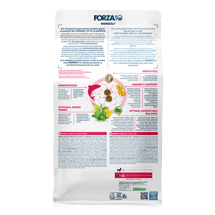 Forza10 Monodiet Mini/Toy Adult Sensitive Digestion, 1,5кг. Полноценный диетический корм для взрослых собак средних и крупных пород с чувствительным пищеварением. ПРЕИМУЩЕСТВА: ✔ Гипоаллергенный : формула, разработанная для смягчения общей пищевой непереносимости, проявляющейся во многих различных формах ✔ Монопротеин: в состав входят только анчоусы, выловленные в чистейших поверхностных водах ✔ Беззерновой: не содержит зерновых — в формулу добавлены углеводы, полученные из картофеля и гороха ✔ Сила лекарственных трав: активные растительные экстракты, которые поддерживают естественную способность организма поддерживать оптимальное состояние здоровья ✔ Поддержка иммунитета: сбалансированное соотношение Омега-3 и Омега-6 1:2, формула с орегано (Origanum vulgare) и тимьяном ( Thymus vulgaris ), известными своими исключительными антибактериальными свойствами и эффективным противогрибковым действием ✔ Оптимальный баланс микрофлоры: содержит пребиотики (MOS и FOS), которые способствуют сбалансированной бактериальной флоре. В состав входят бурые водоросли (Ascophyllum nodosum) , богатые пищевыми волокнами, и одуванчик (Taraxacum officinale), который стимулирует мочеиспускание и очищает печень.