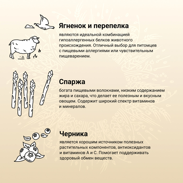 Состав: сырой ягненок (25%), сырой перепел (10%), куриный жир, дегидратированный белок ягненка (10%), дегидратированный перепелиный белок (6%), дегидратированный куриный белок, рыбий жир (лососевый), спельта, бурый рис, ячмень, овес, просо, гидролизованный рыбий белок (треска, пикша), гидролизованные белки птицы (курица, индейка), куриные потроха (печень, сердце, почки), куриные хрящи (источник глюкозамина и хондроитина сульфата), сухое яйцо (куриное), льняное семя, сухая свекольная пульпа, люцерновая мука, волокна гороха, сушеная спаржа (0,5%), сушеная черника (0,5%), сушеная клюква, сушеная ацерола, инулин цикория (0,4%), дрожжевой экстракт (источник маннанолигосахаридов) (0,3%), фруктоолигосахариды (0,3%), аскофиллум узловатый (Ascophyllum Nodosum), карбонат кальция, монокальцийфосфат, хлорид калия, хлорид натрия, сухие пивные дрожжи, розмарин, куркума, календула, семена и шелуха подорожника, юкка Шидигера. Питательная ценность: сырой белок 32,65%; сырой жир 19,4%; сырая клетчатка 1,6%; сырая зола 6,7%; кальций - 1,15%; фосфор - 0,9%; Омега-6 жирные кислоты - 3,1%; Омега-3 жирные кислоты - 0,7%; докозагексаеновая кислота (ДГК) - 0,4%; эйкозапентаеновая кислота (ЭПК) - 0,2%; глюкозамин – 1400 мг/кг, хондроитина сульфат - 1100 мг/кг. Энергетическая ценность: 3967 ккал/кг. Питательные добавки на 1 кг: витамин А – 19000ME; витамин D3 – 1900ME; витамин Е – 225 мг; витамин С – 190 мг; ниацинамид - 57 мг; D-пантенол - 23,7 мг; витамин B2 - 11,9 мг; витамин B6 - 7,1 мг; витамин B1 - 11,9 мг; биотин - 0,57 мг; фолиевая кислота - 0,57 мг; витамин B12 - 0,1 мг; холина хлорид - 2750 мг; Цинк (Хелат цинка гидрата глицина) - 98,7 мг; Марганец (Хелат марганца гидрата глицина) - 21 мг; Железо [Хелат железа (II) гидрата глицина] - 75,6 мг; Медь [Хелат меди (II) гидрата глицина] - 14,7 мг; Йод (безводный йодат кальция) - 2,1 мг; Cелен (L-селенометионин) - 0,36 мг; DL-метионин, технически чистый 3000 мг; Tаурин 990 мг; L-карнитин 200 мг. Антиоксиданты: экстракт токоферолов из растительных масел.