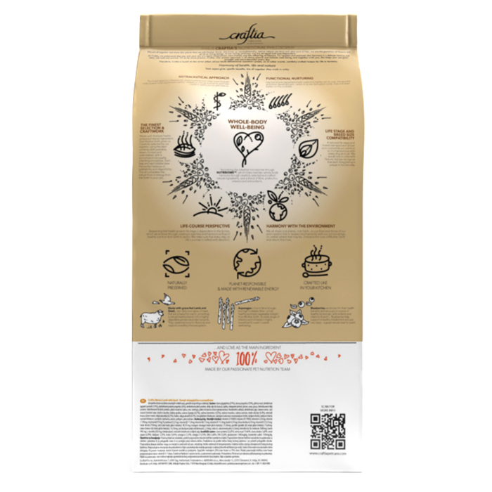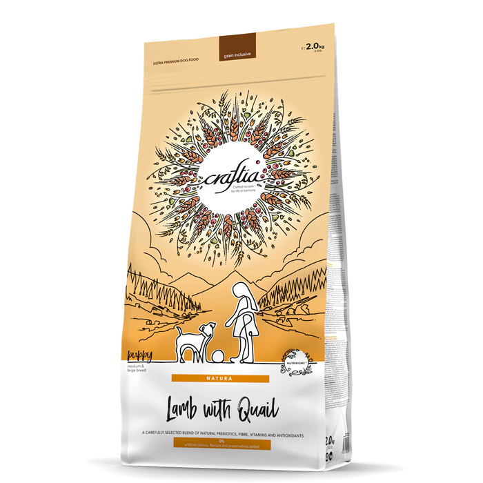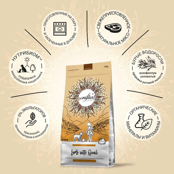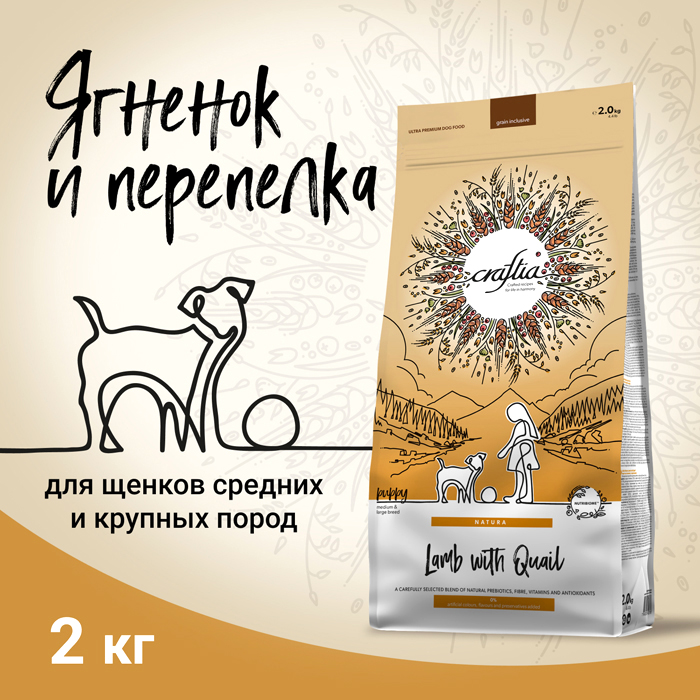 CRAFTIA NATURA сухой корм для щенков средних и крупных пород из ягненка с перепелкой, 2кг. CRAFTIA NATURA — корм для собак ультрапремиум класса, созданный с любовью к природе. Основные источники белка в корме — свежее мясо ягненка и перепелки. Это редко встречающиеся ингредиенты, поэтому они подходят животным, склонным к возникновению аллергических реакций. ● Ягненок и перепелка — отличные источники незаменимых аминокислот, витаминов и минералов. Они легко усваиваются, помогают поддерживать оптимальный вес питомца, стабилизируют обмен веществ. ● Источники углеводов — спельта, бурый рис, ячмень, овес и просо. Специально подобраны злаки с разным гликемическим индексом, чтобы питомец дольше чувствовал себя сытым: глюкоза поступает в организм постепенно, а значит, чувство голода не наступает дольше. ● Источники клетчатки — свекольная пульпа, волокна гороха и люцерновая мука. Свекольная пульпа способствует здоровью слизистой кишечника, гороховая клетчатка стимулирует перистальтику, а люцерновая мука способствует размножению полезной микрофлоры кишечника. ● Суперфуды в корме — спаржа, черника, клюква, ацерола и многие другие. Суперфуды являются источниками витаминов, биологически активных компонентов и обладают антиоксидантными свойствами. Попробуйте Craftia, ощутите уверенность в качестве корма своего питомца — и наслаждайтесь жизнью в гармонии с природой!