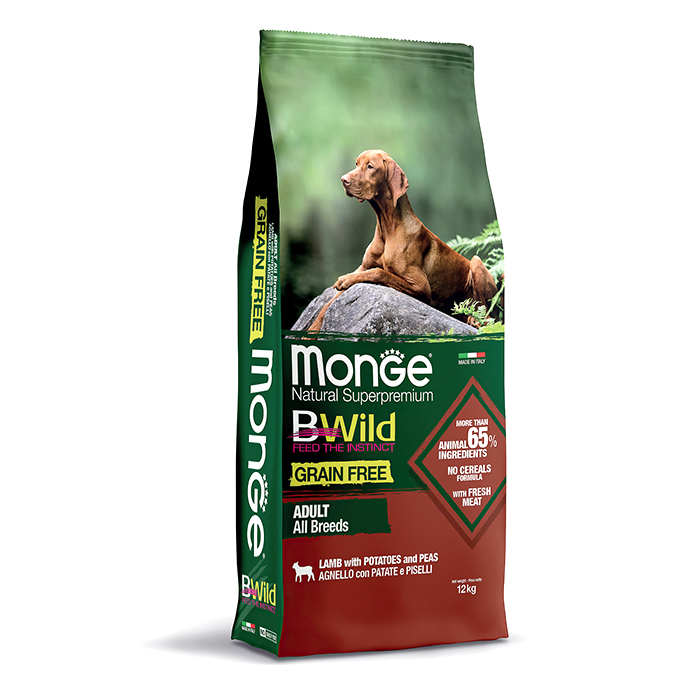 MONGE GRAIN FREE ALL BREEDS ADULT CON AGNELLO, PATATE E PISELLI — это полноценный сбалансированный беззерновой рацион для взрослых собак всех пород, склонных к аллергической реакции на глютен, а также для молодых животных, ведущих активный образ жизни. Появление линии кормов BWild Grain Free было обусловлено идеей создания для собак рациона питания, аналогичного тому, которое получали их неодомашненные предки, получавшие высокобелковую пищу и не употреблявшие зерновые продукты.