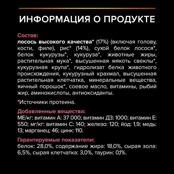 Состав: Лосось высокого качества* (17%) (включая голову, кости, филе), рис* (14%), сухой белок лосося*, белок кукурузы*, кукуруза*, животные жиры, кукурузная крупа*, растительная мука*, высушенная мякоть свеклы*, гидролизат белка животного происхождения, кукурузный крахмал, высушенная растительная клетчатка, минеральные вещества, яичный порошок*, соевое масло, аминокислоты, витамины, рыбий жир, антиоксиданты. *Источники протеина. Гарантируемые показатели: белок: 28,0%, содержание жира: 18,0%, сырая зола: 6,5%, сырая клетчатка: 3,0%, таурин: 0,1%. Добавленные вещества: МЕ/кг: витамин А: 37 000; витамин Д3: 1000; витамин E: 550; мг/кг: витамин C: 140; железо: 120; йод: 1,9; медь: 13; марганец: 46; цинк: 110.