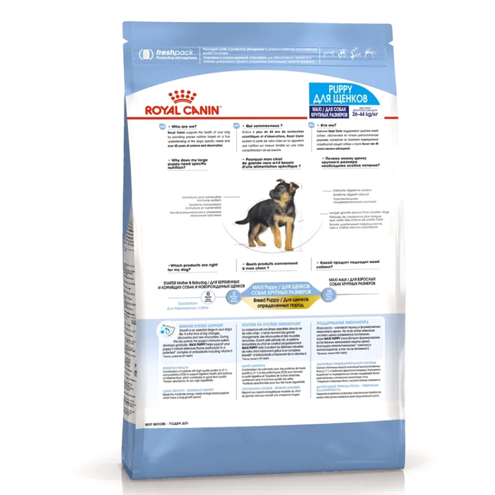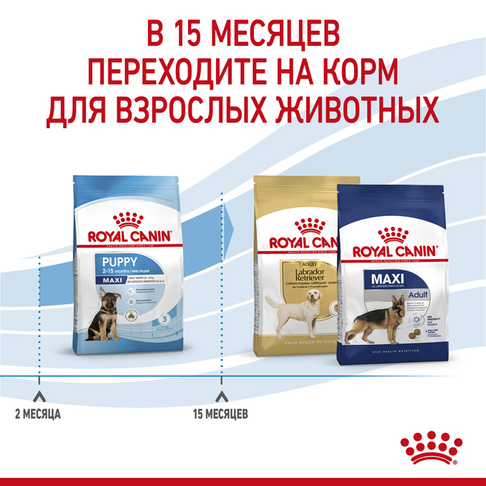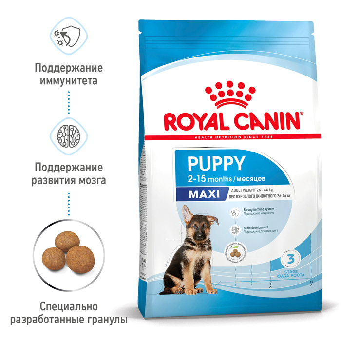 Формула продукта ROYALCANIN® Maxi Puppy разработана с учетом потребностей щенков крупных пород (вес взрослой собаки 26-44 кг) и подходит для щенков в возрасте от 2 до 15 месяцев. Этот продукт также поддерживает формирование здоровой иммунной системы щенка за счет содержания питательных веществ с научно доказанной эффективностью, таких как витамины С и Е. Специально разработанный рацион обогащен полиненасыщенной жирной кислотой Омега-3 (ДГК), которая, как научно доказано, поддерживает развитие мозга щенка. Благодаря сочетанию пребиотиков (МОС) и легкоусвояемых белков, формула ROYALCANIN® Maxi Puppy поддерживает баланс микрофлоры кишечника, способствуя здоровому пищеварению. Гранулы ROYALCANIN® Maxi Puppy разработаны с учетом уникальных потребностей щенков крупных пород. Форма и размер гранул помогают регулировать скорость потребления корма и способствуют насыщению. Поддерживают здоровье полости рта за счет эффекта механической очистки зубов во время разгрызания гранул. В возрасте 15 месяцев период роста подойдет к завершению, и потребности вашего щенка в питательных веществах изменятся. Ему будет необходим другой рацион, разработанный специально для взрослых собак крупных пород. В этом возрасте вы сможете перевести своего питомца на корм ROYALCANIN® Maxi Adult, представленный в виде сухих гранул или влажных кусочков в соусе.