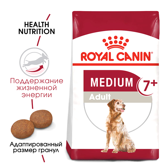 ROYAL CANIN® Medium Adult 7+ содержит все необходимые питательные вещества для поддержания здоровья собак пород среднего размера в зрелые годы, в период проявления первых признаков старения.