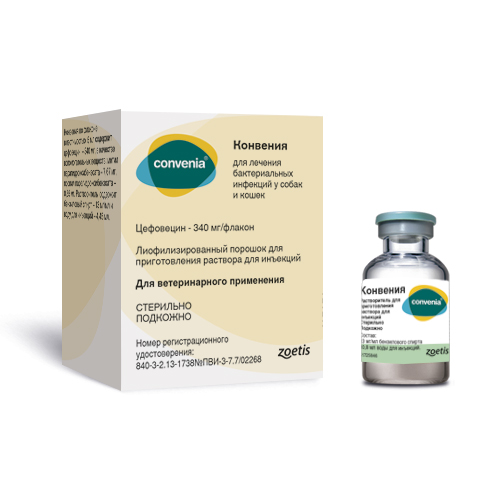 Конвения - пролонгированный антибиотик группы цефалоспоринов III поколения широкого спектра действия. Одна инъекция обеспечивает терапевтическую концентрацию в течение 14 дней. Применяется при инфекциях кожи, мягких тканей, полости рта и мочевыводящих путей у собак и кошек.