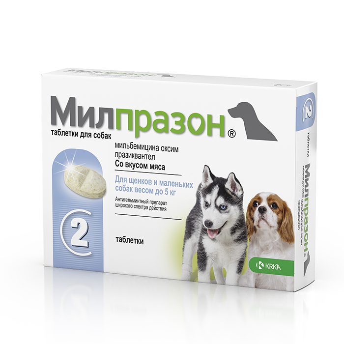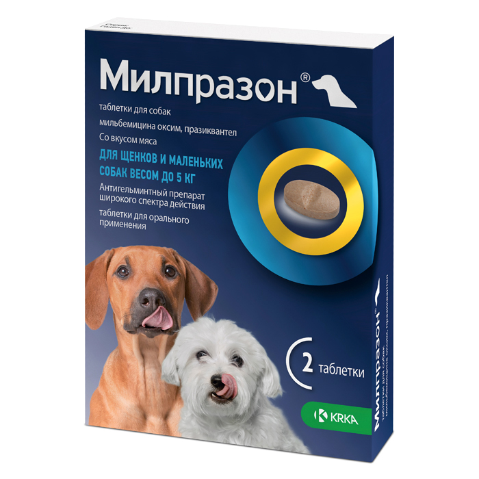 МИЛПРАЗОН препарат антигельминтный для щенков и собак весом до 5кг, таблетки со вкусом мяса, 2 таблетки, KRKA Milprazon