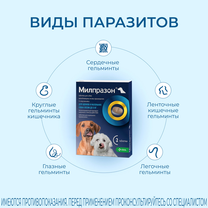 Милпразон® — препарат, помогающий избавить вашего питомца от самого широкого спектра круглых и ленточных гельминтов — кишечных, легочных и глазных, а также предотвратить заражение смертельно опасными сердечными гельминтами– дирофиляриями, предающимися через укусы комаров. Активен против взрослых и личиночных форм паразитов. Для лечения и профилактики кишечных гельминтов применяется однократно. Достоинства препарата: