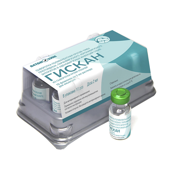 ГИСКАН сыворотка поливалентная против чумы плотоядных, парвовирусного, коронавирусного энтеритов и аденовирусных инфекций собак, 2мл, 1доза. ПРИМЕНЕНИЕ: ГИСКАН применяют для профилактики и лечения чумы плотоядных, парвовирусного, коронавирусного энтеритов и аденовирусных инфекций собак.