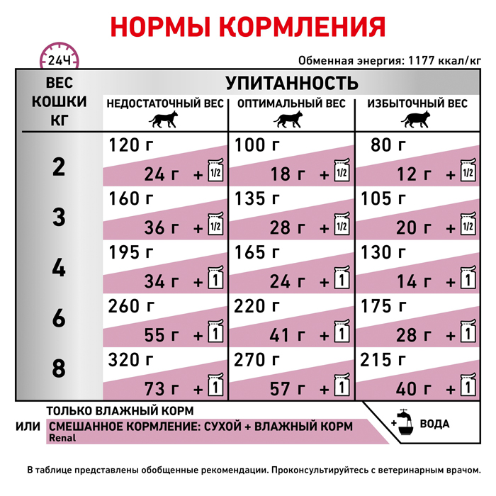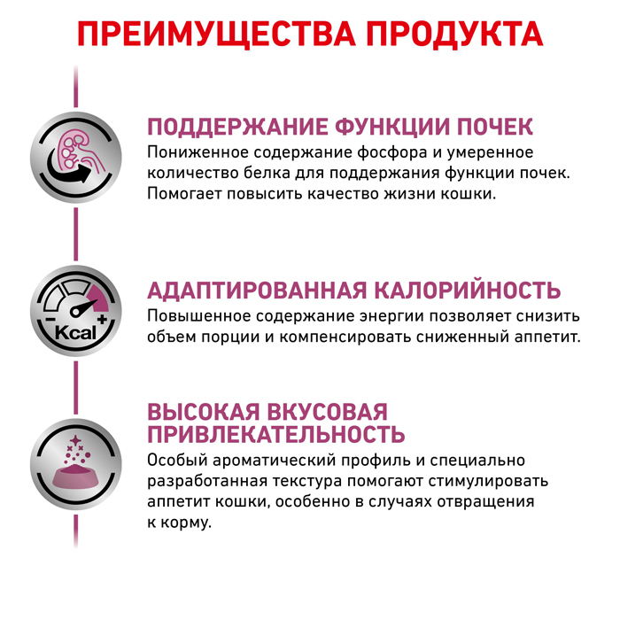 ПОКАЗАНИЯ: Хроническая почечная недостаточность (ХПН). Профилактика рецидивов образования камней оксалата кальция у кошек с ослабленной функцией почек. Профилактика рецидивов уролитиаза, вызванного снижением уровня рН мочи. ПРОТИВОПОКАЗАНИЯ: беременность, лактация, рост. ПРЕИМУЩЕСТВА: При ХПН почки теряют способность надлежащим образом выводить фосфор. Низкое содержание фосфора в продукте способствует замедлению развития болезни. Высокое качество и адаптированное содержание белков способствуют снижению нагрузки на почки. ХПН может привести к метаболическому ацидозу, поэтому в состав продуктов входят подщелачивающие вещества. У животных с ХПН довольно часто наблюдается потеря аппетита, анорексия. Специально разработанный ароматический профиль помогает удовлетворить особые вкусовые предпочтения кошки.