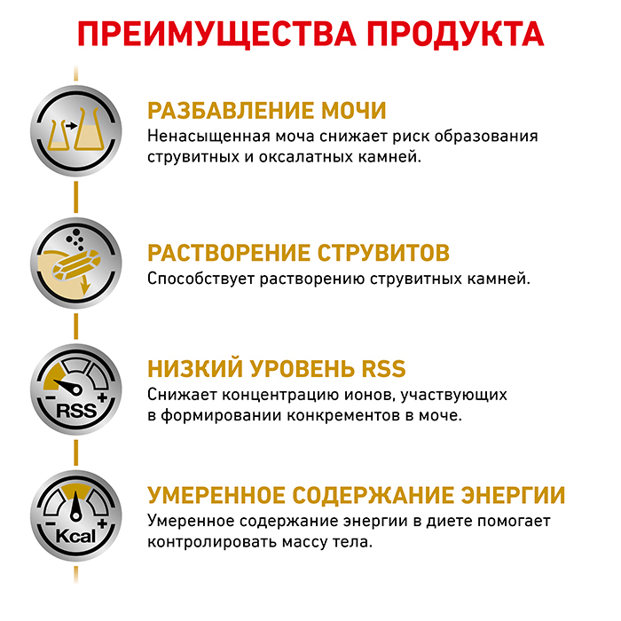 ПРЕИМУЩЕСТВА: Снижение концентрации мочи делает ее менее благоприятной для образования струвитных и оксалатных кристаллов. Способствует растворению струвитных уролитов. Пониженная калорийность способствует поддержанию оптимального веса. Способствует созданию среды, неблагоприятной для формирования кристаллов струвита и оксалата кальция. Масса нетто: 85 г.