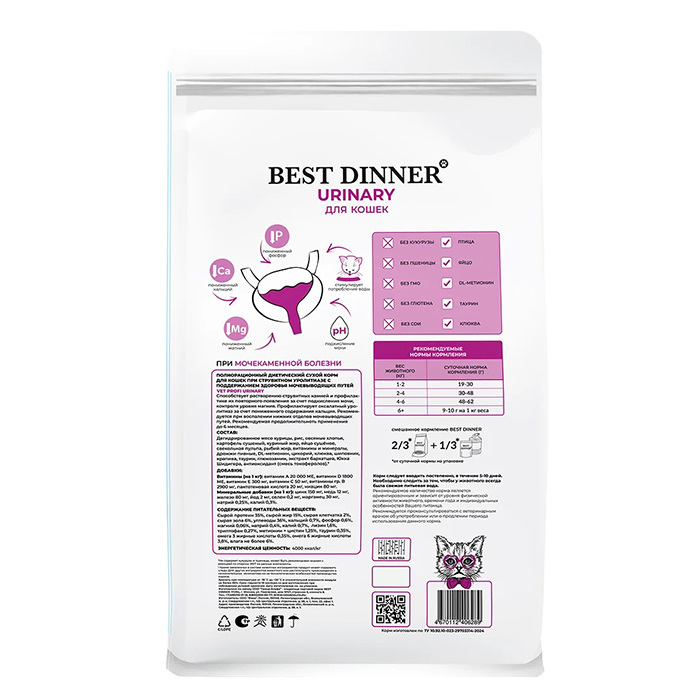 Best Dinner Vet Profi Urinary полнорационный диетический cухой корм для кошек при струвитном уролитиазе для поддержания здоровья мочевыводящих путей, 400г. Способствует растворению струвитных камней и профилактике их повторного появления за счет подкисления мочи, контроля уровня магния. Профилактирует оксалатный уролитиаз за счет пониженного содержания кальция. Рекомендуется при воспалении нижних отделов мочевыводящих путей. Рекомендуемая продолжительноть применения до 6 месяцев. Рекомендуется проконсультироваться с ветеринарным врачом об употреблении или о продлении периода использования данного корма. Вода должна быть доступна кошке в любое время.