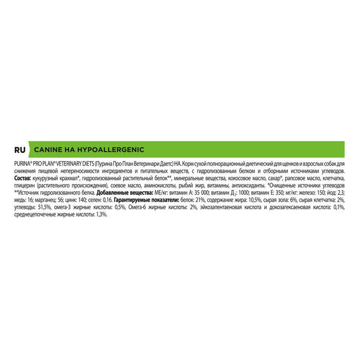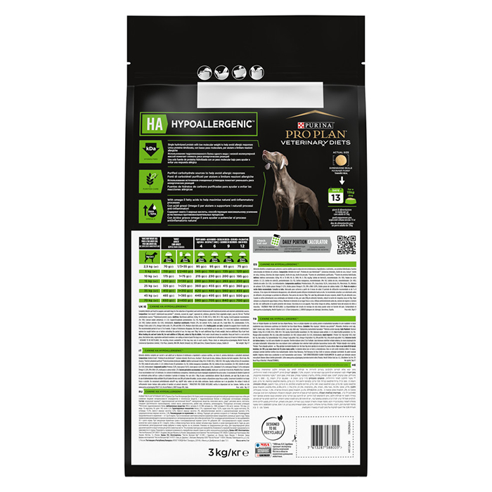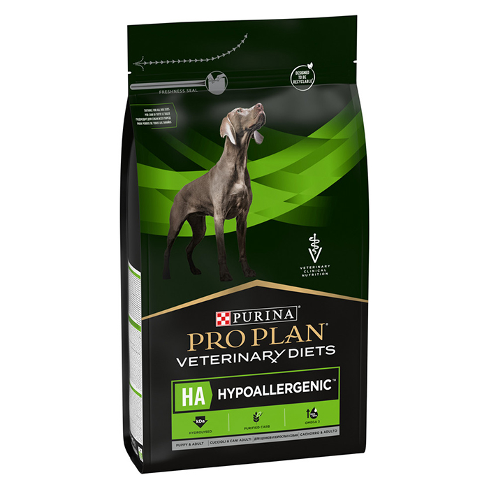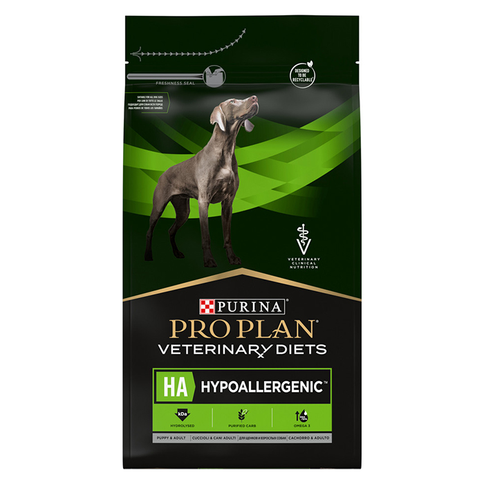 Purina Pro Plan Veterinary diets HA 3 кг. Корм сухой полнорационный диетический для щенков и взрослых собак при аллергических реакциях. Корм Гипоаллергеник рекомендуется для снижения непереносимости ингредиентов и питательных веществ, на основе специально отобранных источников белка и углеводов. Использование гидролизованного белка одного вида с низкой молекулярной массой помогает снижать риск аллергических реакций. Использование очищенных источников углеводов помогает уменьшить риск аллергических реакций. Содержит омега-3 жирные кислоты, способствующие максимальному усилению естественных противовоспалительных процессов.