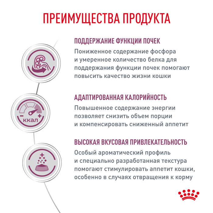 ПОКАЗАНИЯ: Хроническая почечная недостаточность (ХПН). Профилактика рецидивов образования камней оксалата кальция. Профилактика рецидивов уратов, цистинов, вызванных снижением уровня рН мочи. Продукт отличается низким содержанием фосфора, содержит комплекс антиоксидантов, жирные кислоты ЕРА и DHA. При ХПН почки теряют способность надлежащим образом выводить фосфор. Низкое содержание фосфора в продукте способствует замедлению развития болезни. Высокое качество и адаптированное содержание белков способствуют снижению нагрузки на почки. ХПН может привести к метаболическому ацидозу, поэтому в состав продукта входят подщелачивающие вещества. У животных с ХПН довольно часто наблюдается потеря аппетита, непереносимость корма, анорексия. Специально разработанный ароматический профиль помогает удовлетворить особые вкусовые предпочтения кошки.