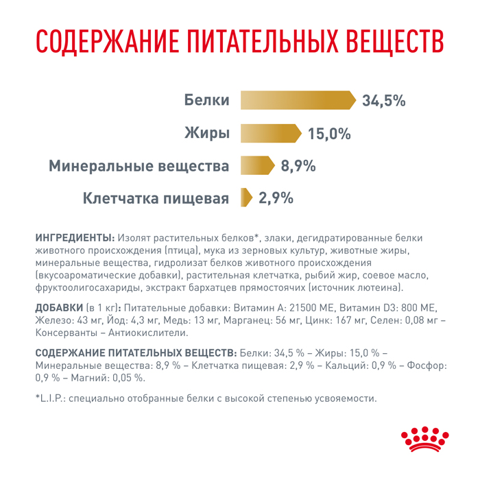 ИНГРЕДИЕНТЫ: рис, изолят растительных белков*, дегидратированные белки животного происхождения (птица), пшеница, животные жиры, гидролизат белков животного происхождения (вкусоароматические добавки), растительная клетчатка, минеральные вещества, мука из зерновых культур, рыбий жир, соевое масло, фруктоолигосахариды, гидролизат из панциря ракообразных (источник глюкозамина), экстракт бархатцев прямостоячих (источник лютеина). ДОБАВКИ (в 1 кг): Питательные добавки: Витамин A: 22000 ME, Витамин D3: 800 ME, Железо: 46 мг, Йод: 3,5 мг, Медь: 8 мг, Марганец: 48 мг, Цинк: 194 мг, Ceлeн: 0,29 мг - Консерванты - Антиокислители. СОДЕРЖАНИЕ ПИТАТЕЛЬНЫХ ВЕЩЕСТВ: Белки: 34,5 % - Жиры: 15 % - Минеральные вещества: 7,4 % - Клетчатка пищевая: 2,1 % - Кальций: 0,8 % - Фосфор: 0,7 % - Натрий: 0,9 % - Магний: 0,05 % - Калий: 1 % - Хлориды: 1,9 % - Сера: 0,5 % - Общий таурин: 0,2 % - Вещества, подкисляющие мочу: кальция сульфат (0,7 %), DL-метионин. *L.I.P.: специально отобранные белки с высокой степенью усвояемости.Информация об ингредиентах и нутриентном составе на сайте является справочной. Вся информация о продукте представлена непосредственно на упаковке.