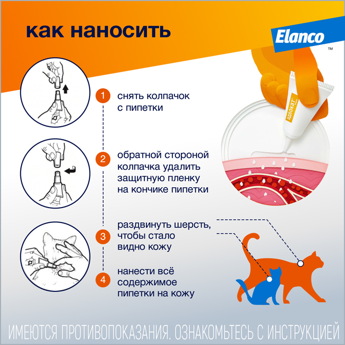 ✔ Для уничтожения блох обработку проводят однократно, у кошек – 1 раз в 4 недели. ✔ Для лечения ушной чесотки (отодектоза) препарат применяют на холку однократно. При необходимости курс лечения повторяют через 1 месяц. ✔ Для лечения нотоэдроза и легочного капилляриоза препарат применяют на холку однократно. ✔ Для дегельминтизации препарат применяют однократно. ✔ Для профилактики сердечной формы дирофиляриоза препарат применяют ежемесячно, начиная за 1 месяц до начала лета комаров (переносчиков возбудителя D. immitis) и заканчивая через 1 месяц после завершения лета комаров. Противопоказания: Противопоказанием к применению является повышенная индивидуальная чувствительность животного к компонентам препарата. Не следует применять котятам моложе 9-недельного возраста, больным инфекционными болезнями или выздоравливающим кошкам. ИМЕЮТСЯ ПРОТИВОПОКАЗАНИЯ. ОЗНАКОМЬТЕСЬ С ИНСТРУКЦИЕЙ.
