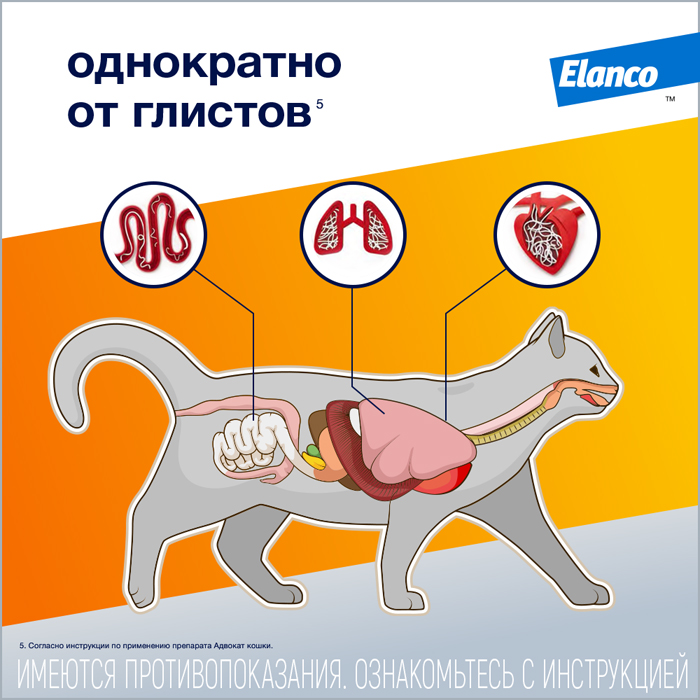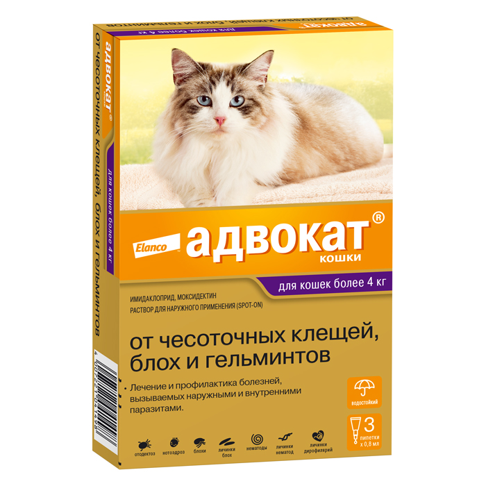 Адвокат® кошки, капли на холку от блох, чесоточных клещей и круглых гельминтов для кошек весом свыше 4 кг – 3 пипетки. Адвокат® кошки – комплексный препарат компании Elanco, который помогает защищать вашего питомца от широкого спектра внешних (блох, чесоточных клещей) и внутренних (глистов) паразитов. Адвокат® кошки прост в применении – капли наносятся на холку в дозировке согласно весу кошки. Производится в Германии. Характеристики: ✅ комплексный препарат в виде капель на холку от блох, чесоточных клещей и гельминтов ✅ широкий спектр действия – 7 видов паразитов ✅ однократно от ушного клеща ✅ действует в течение 1 месяца после нанесения ✅ для котят и кошек весом от 4 кг ✅ разрешен котятам с 9-недельного возраста ✅ срок годности 3 года ✅ доступен в упаковке по 1 и 3 пипетки ✅ продукт компании Elanco, производится в Германии. Показания: Адвокат® кошки – комплексный препарат широкого спектра, действующий на:
