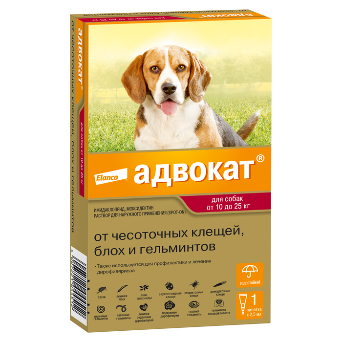 Адвокат®, капли на холку от блох, чесоточных клещей и круглых гельминтов для собак весом от 10 до 25кг – 1 пипетка. Адвокат®– комплексный препарат компании Elanco, который помогает защищать вашего питомца от широкого спектра внешних (блох, вшей, власоедов, чесоточных клещей) и внутренних (глистов) паразитов. Адвокат® прост в применении – капли наносятся на холкув дозировкесогласно весу собаки. Производится в Германии. Характеристики: ✅ комплексный препарат в виде капель на холку от блох, чесоточных клещей и гельминтов ✅ широкий спектр действия – 18 видов паразитов ✅ профилактика сердечных гельминтов ✅ действует в течение 1 месяца после нанесения ✅ для щенков и собак весом от 10 до 25кг ✅ разрешен щенкам с 7-недельного возраста ✅ срок годности 3 года ✅ доступен в упаковке по 1 и 3 пипетки ✅ продукт компании Elanco, производится в Германии. Показания: Адвокат® –комплексный препарат широкого спектра, действующий на: