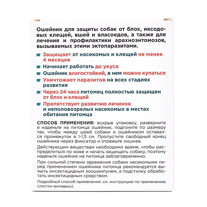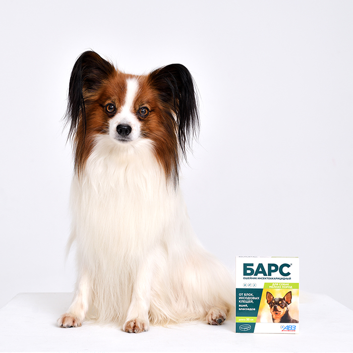 БАРС ошейник инсектоакарицидный для мелких собак, 35см. Ошейник для собак для борьбы с насекомыми и иксодовыми клещами. ПОКАЗАНИЯ К ПРИМЕНЕНИЮ: Собакам и кошкам с лечебной и профилактической целью при энтомозах (блохи, вши, власоеды) и поражении иксодовыми клещами. ПРЕИМУЩЕСТВА: ✔ Защищает от насекомых и клещей до 4-х месяцев ✔ Оптимальная комбинация действующих веществ надежно прерывает цикл развития паразитов ✔ Максимально безопасный ✔ Предотвращает опасные заболевания, передаваемые блохами и клещами ✔ Нейтральный цвет ошейника позволяет сочетать его с любыми аксессуарами. СОСТАВ И ФАРМАКОЛОГИЧЕСКИЕ СВОЙСТВА: Входящие в состав ошейника для собак от блох и клещей фипронил и дифлубензурон – обладают выраженной активностью в отношении личиночных и половозрелых фаз развития блох, вшей, власоедов и иксодовых клещей, паразитирующих на собаках и кошках. Постепенно выделяясь с поверхности ошейника, активные компоненты переносятся на кожно-волосяной покров животного. Фипронил, не всасываясь в системный кровоток, накапливается в эпидермисе, волосяных луковицах и сальных железах кожи животного и, выделяясь на поверхность кожи вместе с секретом желез, оказывает длительное контактное и кишечное инсектоакарицидное действие. Дифлубензурон - регулятор роста насекомых, подавляет рост покровных тканей у паразитов, нарушая процесс развития личинки в яйце, линьки личинок, препятствует развитию полноценных куколок и вызывает гибель насекомых и клещей на преимагинальных фазах развития. ПОРЯДОК ПРИМЕНЕНИЯ: После вскрытия упаковки ошейник «Барс» от клещей и блох разворачивают и надевают на животное, подгоняя по размеру так, чтобы между шеей животного и ошейником оставался промежуток в 1,0–1,5 см, затем пропускают свободный конец ленты через фиксатор и излишек ошейника срезают. Непрерывное использование инсектоакарицидного ошейника «Барс» обеспечивает защиту собак и кошек от блох, вшей, власоедов, иксодовых клещей до 4-х месяцев. В первые дни применения ошейника возможно нападение и прикрепление иксодовых клещей на животное, но через 1 день паразиты погибают и засыхают или самопроизвольно отпадают. ПРОТИВОПОКАЗАНИЯ: Применять ошейник «Барс» для собак от блох и клещей не рекомендуется беременным в последнюю треть беременности и кормящим самкам, больным инфекционными болезнями и выздоравливающим животным, а также щенкам и котятам моложе 2-х месячного возраста. ПОБОЧНЫЕ ЯВЛЕНИЯ: В редких случаях, при повышенной индивидуальной чувствительности животного к фипронилу, возможны индивидуальные реакции (избыточное слюноотделение, слезотечение, мышечная дрожь, рвота, раздражение кожи). В этих случаях использование ошейника прекращают.