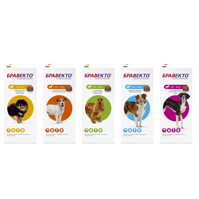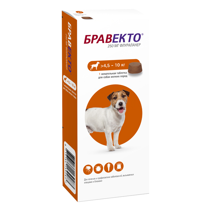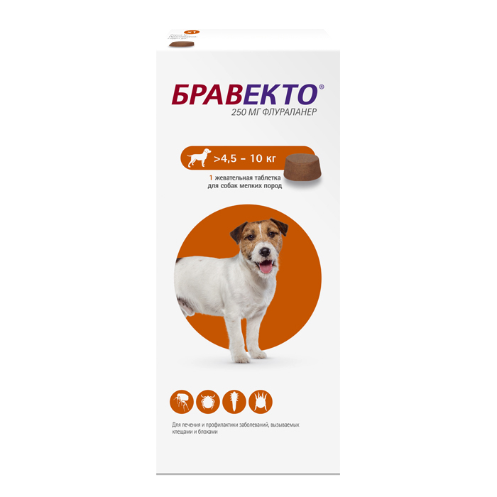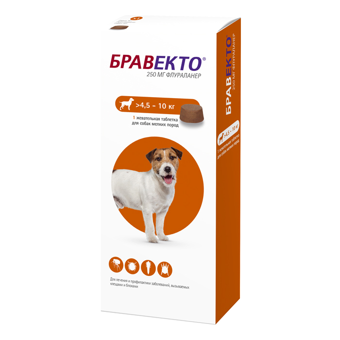 Бравекто 250 мг- жевательные таблетки для мелких и средних собак от блох, иксодовых клещей, подкожных клещей (демодекоза), чесоточных клещей (саркоптоза) и ушных клещей (отодектоза). Одна таблетка защищает собаку от блох и клещей на протяжении 12 недель.Бравекто по степени воздействия на организм относится к веществам малоопасным. Бравекто 250 мгможно давать щенкам всех пород с 8-недельного возраста и весом 4,5-10 кг. Можно применять беременным и кормящим собакам под контролем ветеринарного врача.