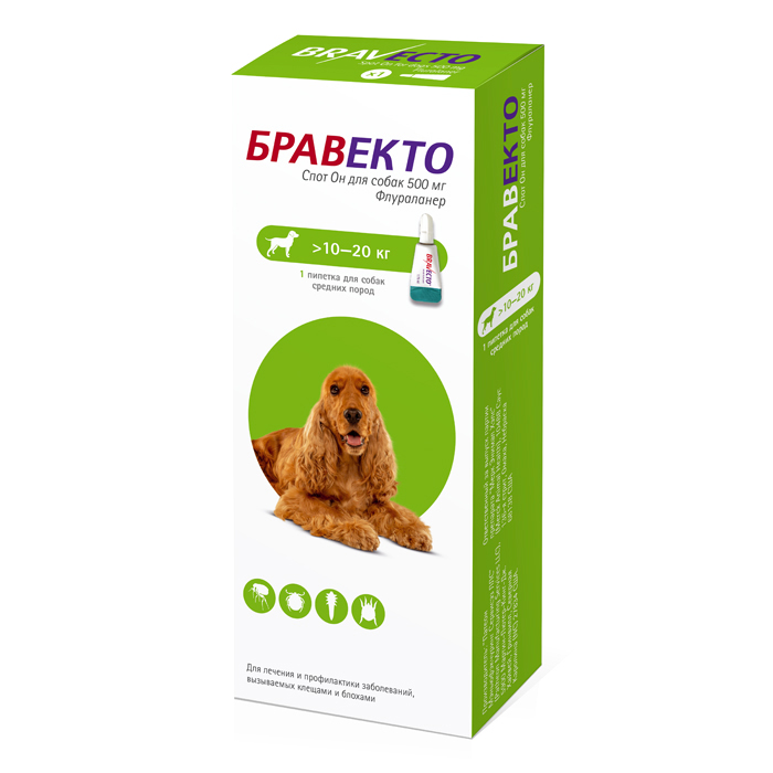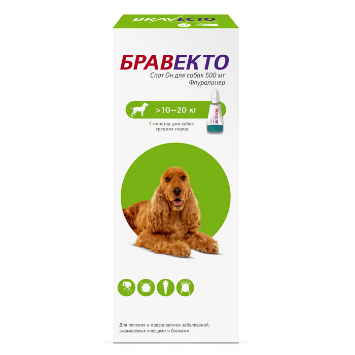 Бравекто 500 мг- капли для средних пород собак от блох, иксодовых клещей, подкожных клещей (демодекоза), чесоточных клещей (саркоптоза) и ушных клещей (отодектоза). Одна пипетка защищает собаку от блох и клещей на протяжении 12 недель, по степени воздействия на организм относится к веществам малоопасным. БРАВЕКТО 500 мг можно применять щенкам всех пород с 8-недельного возраста и весом 10-20 кг.