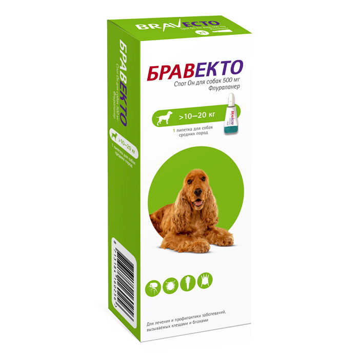 БРАВЕКТО Спот Он 500мг капли от блох и клещей для Собак 10-20 кг, пипетка, BRAVECTO MSD Animal Health