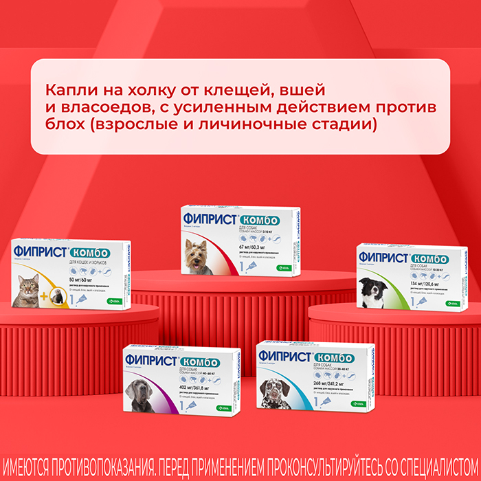 Фиприст® Комбо— капли на холку для защиты собак от иксодовых клещей, блох и власоедов с усиленным действием против блох. Содержит (S)-метопрен – регулятор роста насекомых, действующий на личиночные стадии блох и предотвращающий их развитие во взрослых особей в окружающей среде, для профилактики повторного заражения животного. Достоинства препарата: