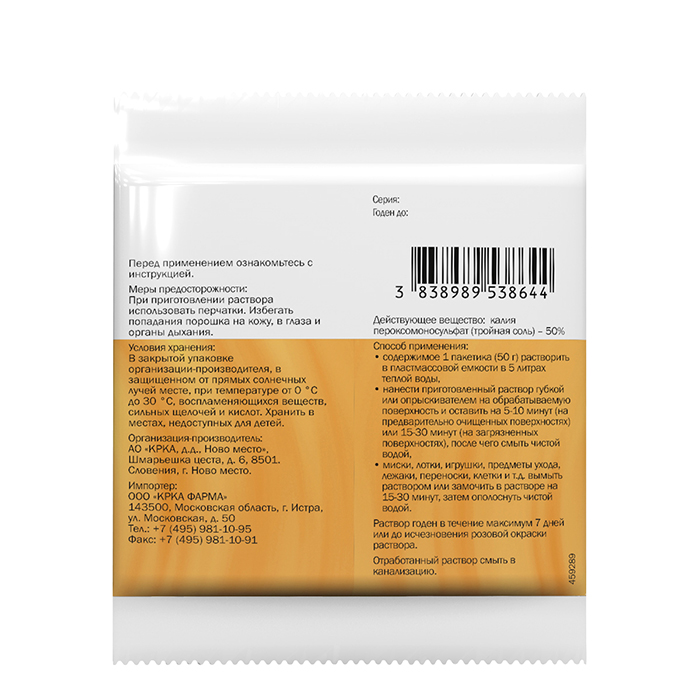 В 1 г Экоцида в качестве действующего вещества содержится 500 мг калия пероксомоносульфата (тройная соль), а в качестве вспомогательных компонентов: поверхностно-активное вещество - додецилбензол сульфонат натрия, органические кислоты, неорганические буферные системы (хлорид натрия, полифосфат натрия), краситель и отдушку цитрусовую.