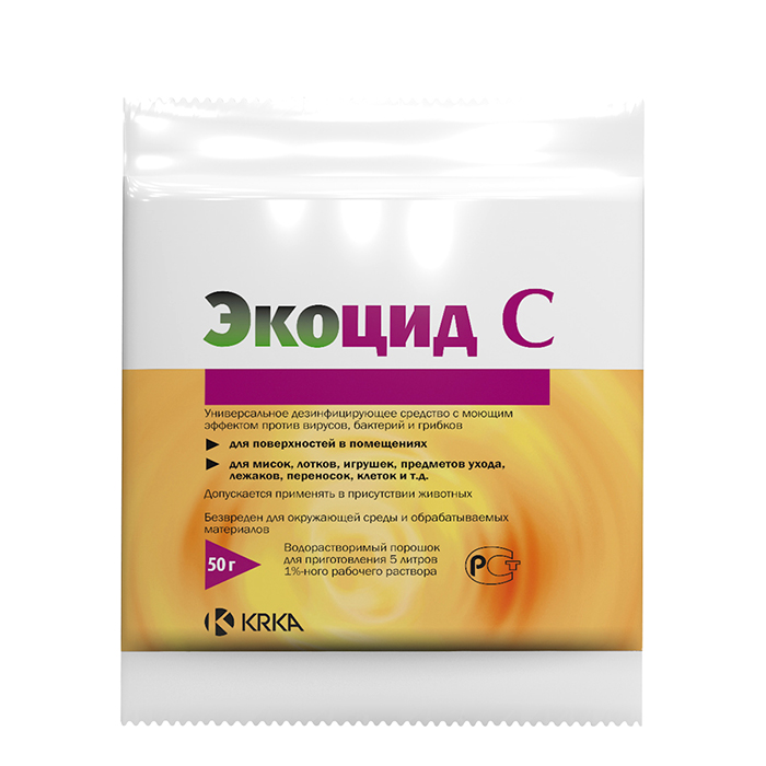 Как применять Экоцид С: Для обработки поверхностей: Нанесите приготовленный раствор Экоцида С губкой или с помощью опрыскивателя, выдержите необходимое время, а затем смойте теплой водой. Для обработки лотков, игрушек, мисок, подстилок, лежаков, мягких переносок и других предметов обихода питомца: замочите вещи, требующие очистки и дезинфекции, в растворе Экоцида С на 15-30 минут, затем прополощите чистой водой и высушите. Если вещи были предварительно очищены или постираны, то для дезинфекции достаточно замочить их в 1% растворе Экоцида С на 5-10 минут. Как приготовитьраствор Экоцида С? Для приготовления 1 % рабочего раствора содержимое пакетика растворяют в воде из расчета 50 г на 5 л воды. Рекомендуется использовать пластмассовую емкость и теплую воду, где препарат быстрее растворяется. При работе с растворами Экоцида С рекомендуется использовать перчатки.