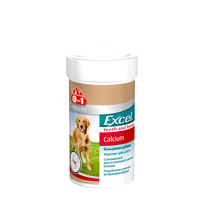 8in1 Excel Calcium 155т. Эксель Кальций – это добавка для щенков и взрослых собак с кальцием и фосфором, обеспечивающая здоровье костей и зубов. Формула обогащена витамином D3 и обеспечивает оптимальное усваивание кальция. Таблетки Эксель Кальций особенно рекомендуются щенкам в период их активного роста, а также для беременных и кормящих собак. Кальциевая добавка. Необходима щенкам в период активного роста, когда их организм испытывает особую потребность в кальции, собакам во время беременности и кормления щенков. Фосфор и витамин D, входящие в состав минеральной добавки, помогают организму усваивать кальций, что особенно важно в период роста. Добавка может применяться в сочетании с поливитаминными комплексами и сбалансированными кормами. Продукт разработан при участии ветеринарных врачей.