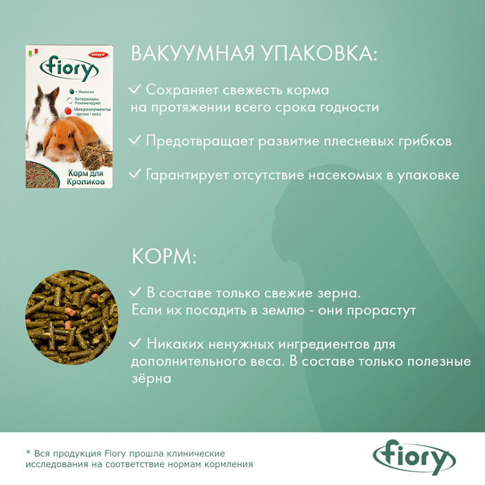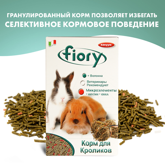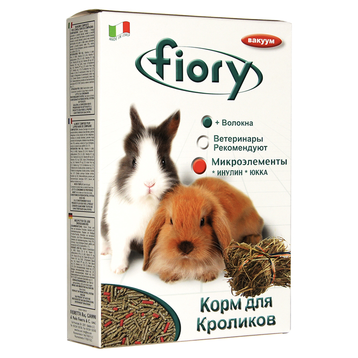 Корм для кроликов гранулированный. Fiory Superpremium Pellettato - полнорационный корм для кроликов. В состав гранул входят полезные овощи, зерна, юкка, органический селен, минералы и инулин. Все эти ингредиенты позволят вашему питомцу надолго сохранить здоровье и красоту. Гранулы легко усваиваются, налаживая работу кишечника, защищают организм, устраняют аммиачные выделения. Вакуумная упаковка сохраняет питательную ценность каждого компонента корма, предотвращает развитие плесневых грибков и насекомых. Произведено в Италии.