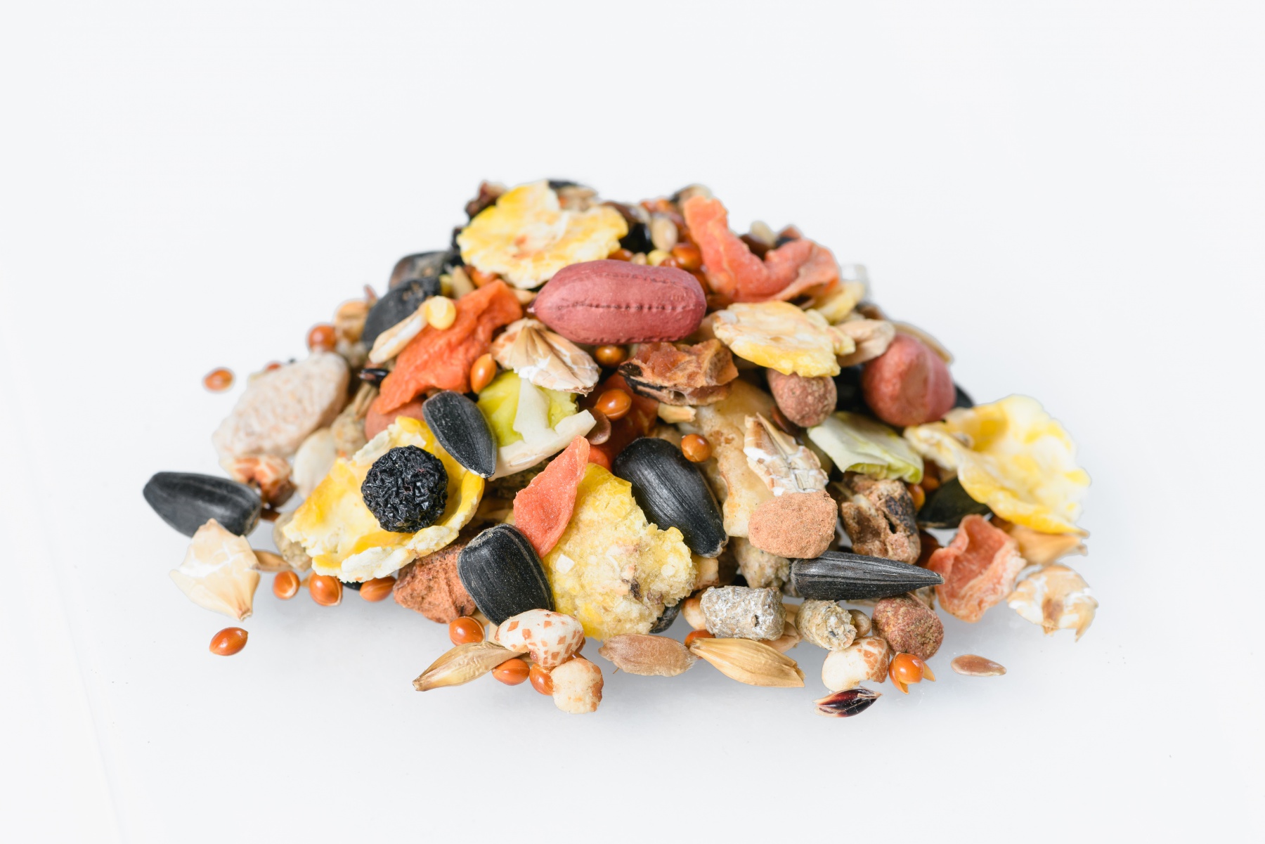 Гранулы, содержащие семена злаковых и бобовых культур, сухие луговые травы, гаммарус, витаминно-минеральный комплекс, пробиотик и пребиотик; просо, пшеница, семена подсолнечника, тыквы, сафлора, канареечника, овсяная крупа, кукуруза, ячмень, горох – все это в натуральном, плющеном или взорванном виде, арахис, плоды рожкового дерева, воздушная греча, сухие овощи, фрукты и ягоды, в том числе морковь, яблоко, топинамбур, рябина черноплодная.