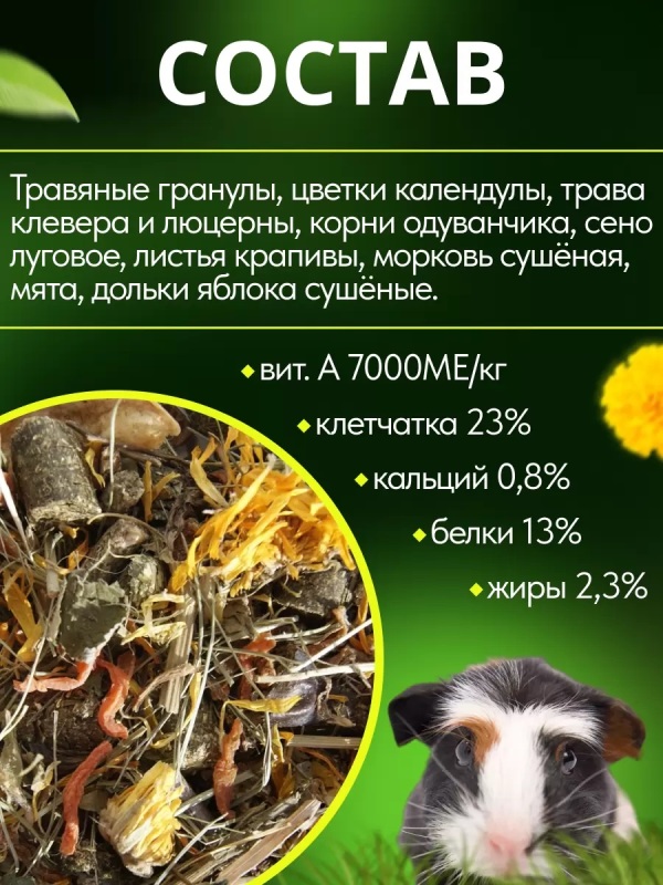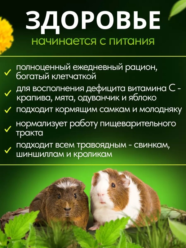 Богатая необходимой для травоядной морской свинки клетчаткой, кормовая смесь подходит кормящим самкам и молодняку. С минимальным содержанием вредных для свинок углеводов. Входящие в состав сено, корни одуванчика способствуют правильному стачиванию зубов и нормализации работы пищеварительного тракта. Крапива, мята, календула богаты витамином С, калием, каротином, витаминами группы В. Тщательно отобранные компоненты беззерновой смеси обеспечат полноценный ежедневный рацион.