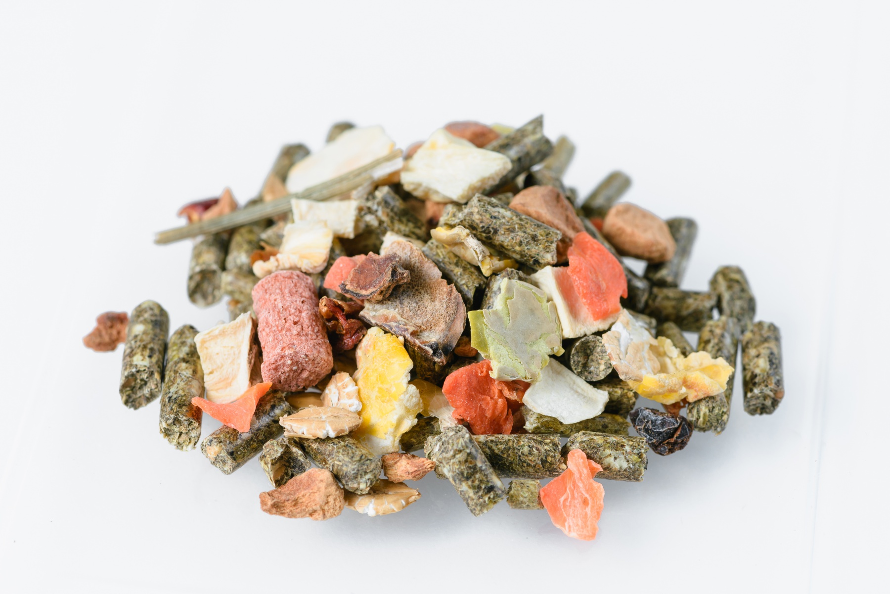 Гранулы из луговых трав, семена злаковых и бобовых растений (в том числе пшеница, ячмень, овес, горох, кукуруза) в натуральном и плющеном виде, сухие овощи, корнеплоды и фрукты (в том числе сушеные морковь, свекла, яблоки, сладкий перец), сушеный укроп, гранулы, содержащие семена злаковых культур, травяную муку с добавлением минеральных веществ, витаминов, пробиотика, пребиотика и энтеросорбента.
