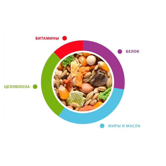 Ингредиенты: злаки (пшеница 25%, овес 20%, кукуруза 20%, ячмень 15%), овощи (горох 9,5%, морковь 1%), семена (арахис 2,5%, гречиха посевная 2,5%, семена тыквы 1%), фрукты (плоды рожкового дерева 2%, виноград 1%, яблоко 0,5%). Анализ: сырой белок 13,5%, целлюлоза 4,5%, жиры и масла 5%, зола 2,5%, влажность 12,5%. Добавки на 1 кг продукта: витамин A 6000 МЕ, витамин D3 750 МЕ, витамин E 10 мг, йод (3b201) 1,5 мг, марганец (3b503) 50 мг, цинк (3b605) 40 мг. Пищевые красители.