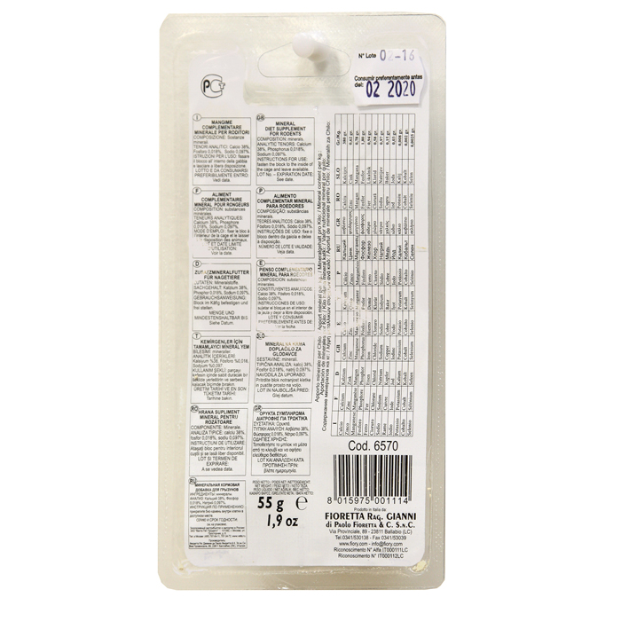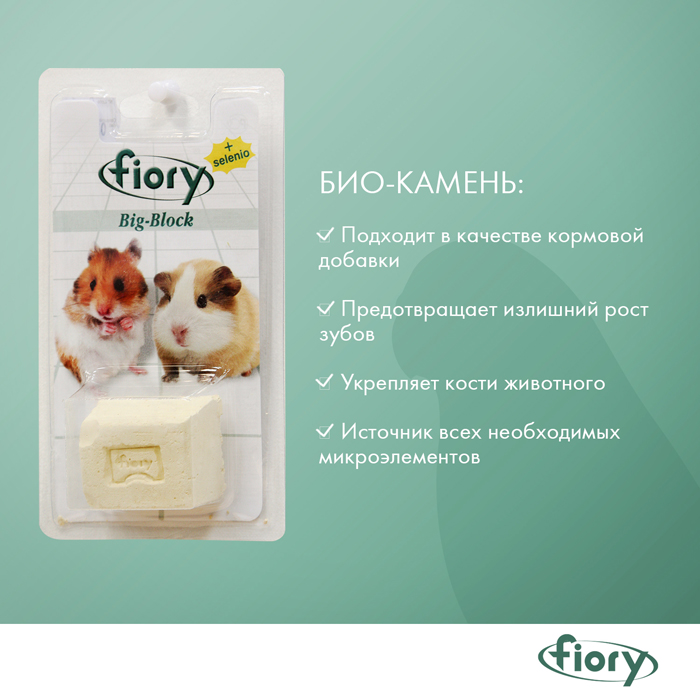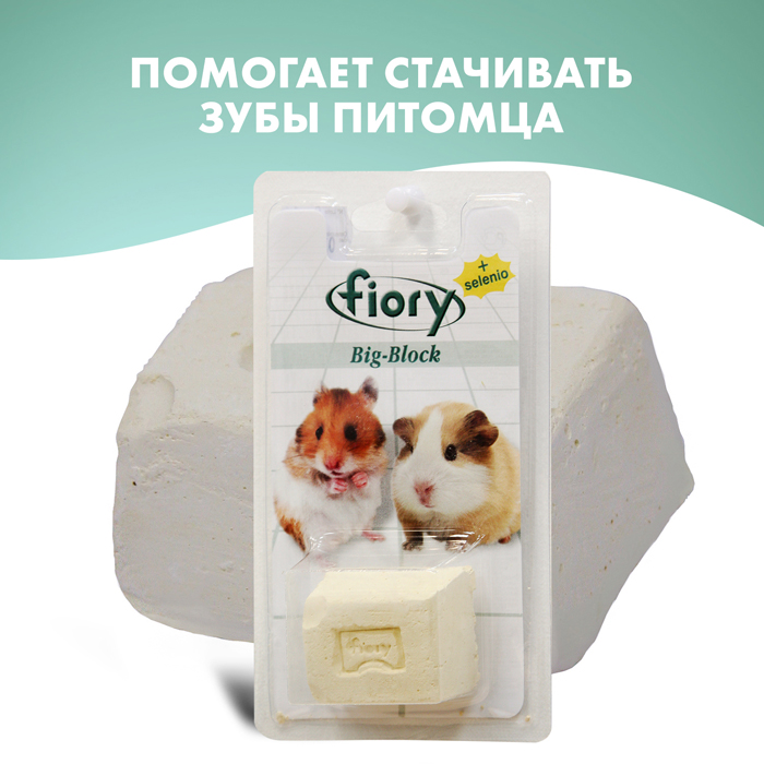 Минеральный камень с селеном для грызунов. Fiory Big Block - минеральный био-камень. Отлично подходит для использования в качестве кормовой добавки, поскольку обеспечивает организм грызуна необходимыми минеральными веществами. В состав био-камня входят 12 различных минералов, среди которых кальций, фосфор, натрий, железо, цинк, магний и селен. Минеральный камень позволяет питомцу укреплять зубы и предотвращать их излишний рост.