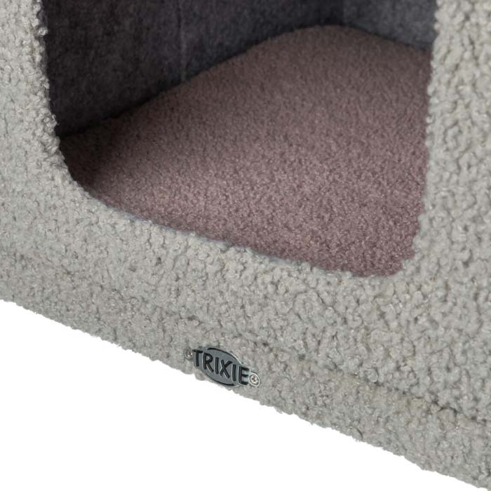 Игровой комплекс для кошек ДЖУНИОР КАРЛИТА – уютное место для отдыха и развлечений вашего питомца. Изготовлен из прочного сизаля и мягкого плюша «тедди» (плотность 270 г/м²), что делает комплекс комфортным и практичным. Включает просторный домик с мягкой лежанкой и съемным двусторонним лежаком, который можно стирать вручную. Верхняя площадка с бортиком идеально подходит для наблюдения и сна. Компактная конструкция с напольной площадью 38×49 см и высотой 63 см. Цвет – серый/лиловый.